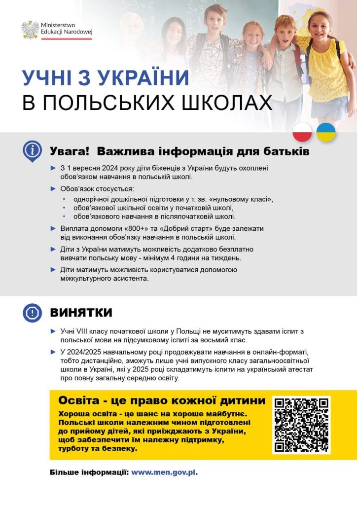 Edukacja, integracja i bezpieczeństwo – to główne cele nowelizacji ustawy o pomocy obywatelom Ukrainy. Od 1 września 2024 r. dzieci uchodźcze z Ukrainy zostaną objęte obowiązkiem rocznego przygotowania przedszkolnego, obowiązkiem szkolnym i obowiązkiem nauki (szkoły ponadpodstawowe) w polskim systemie oświaty – analogicznie jak uczniowie polscy. Naukę online będą mogli realizować wyłącznie uczniowie, którzy w roku szkolnym 2024/2025 uczą się w klasie programowo najwyższej w szkole funkcjonującej w ukraińskim systemie oświaty. Świadczenie rodzinne 800+ i Dobry Start będzie wypłacane uchodźcom z Ukrainy pod warunkiem, że ich dziecko będzie w tzw. zerówce, szkole podstawowej czy szkole ponadpodstawowej.