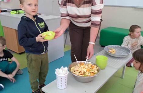 7 kwietnia dzieci z zerówki przypominały sobie i utrwalały zasady zdrowego odżywiania, a własnoręcznie wykonana sałatka owocowa smakowała przepysznie!