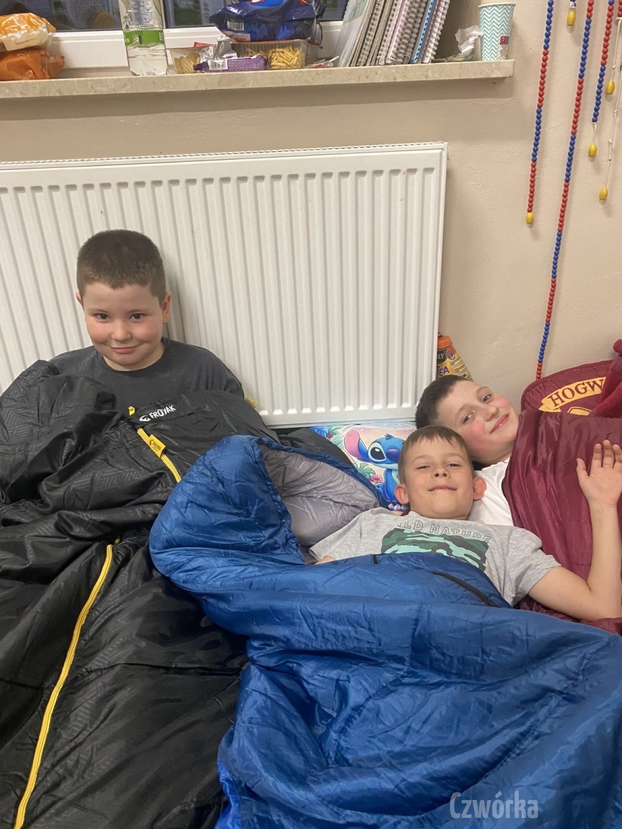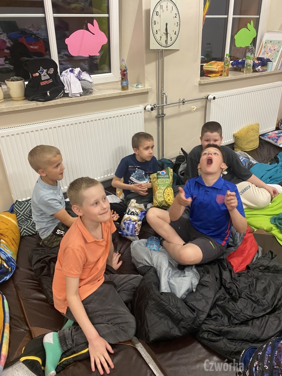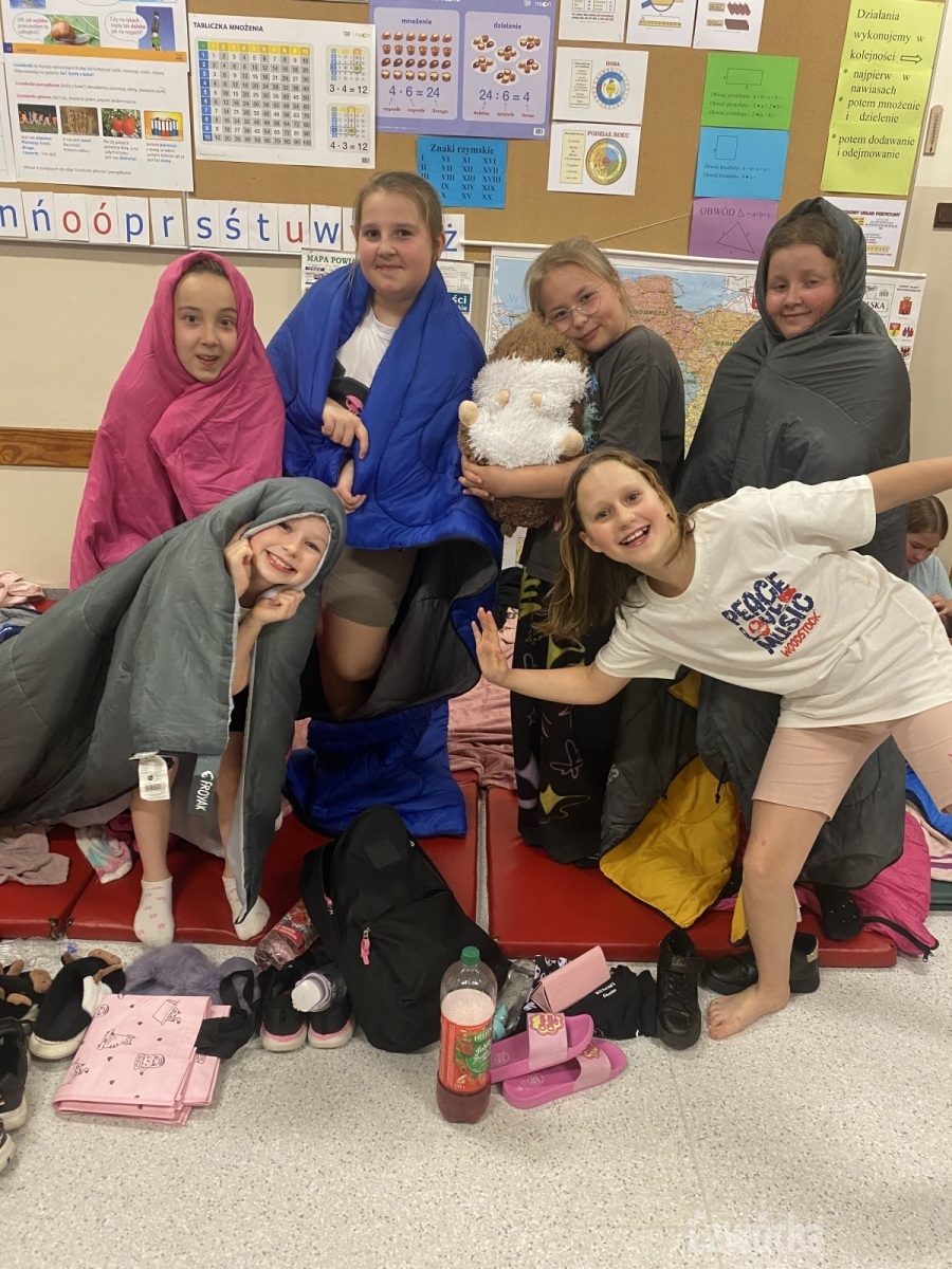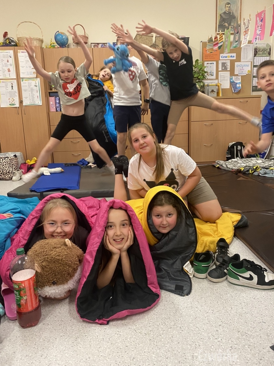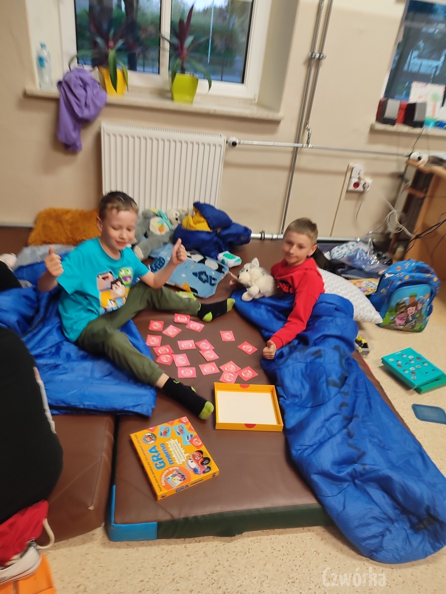 W piątek – 25 kwietnia o godzinie 17.30 do szkoły po raz drugi zaczęli przychodzić uczniowie klasy 2a i klasy 3b. Tym razem zamiast plecaków przynieśli śpiwory, piżamy, nocny prowiant i świetne humory. Najpierw z pomocą rodziców zamienili sale lekcyjne na „ sypialnie jednej nocy”. Następnie odbyły się zawody sportowe w sali gimnastycznej- oczywiście w drużynach byli uczniowie z różnych klas. Po sportowych emocjach i zaciętym kibicowaniu był czas wspólną ulubioną kolację – pizzę, która przygotowali rodzice. Potem były filmy, gry planszowe, poznawanie zakamarków szkoły przy świetle latarek i niekończące się nocne rozmowy z kolegami i koleżankami… Nikt się nie nudził, było radośnie, no i inaczej niż w ciągu dnia.