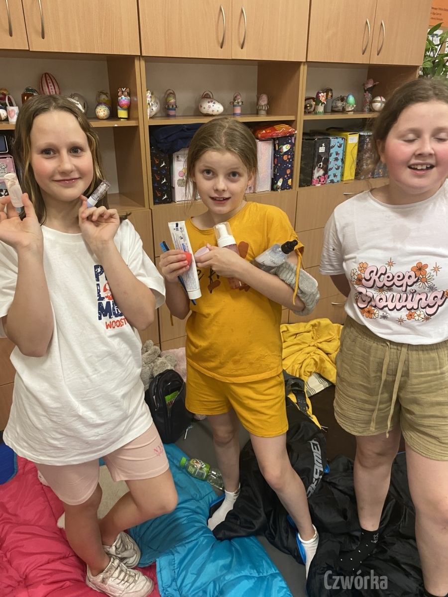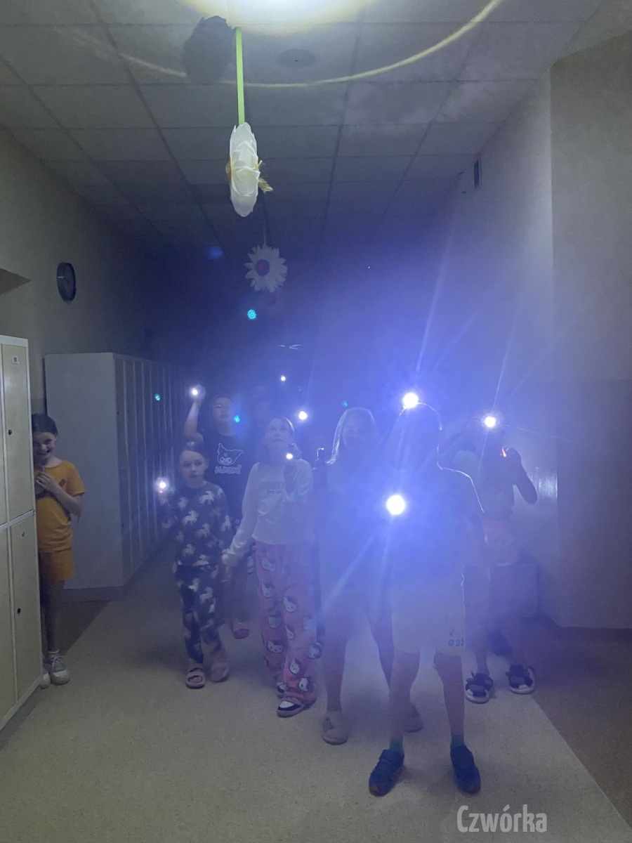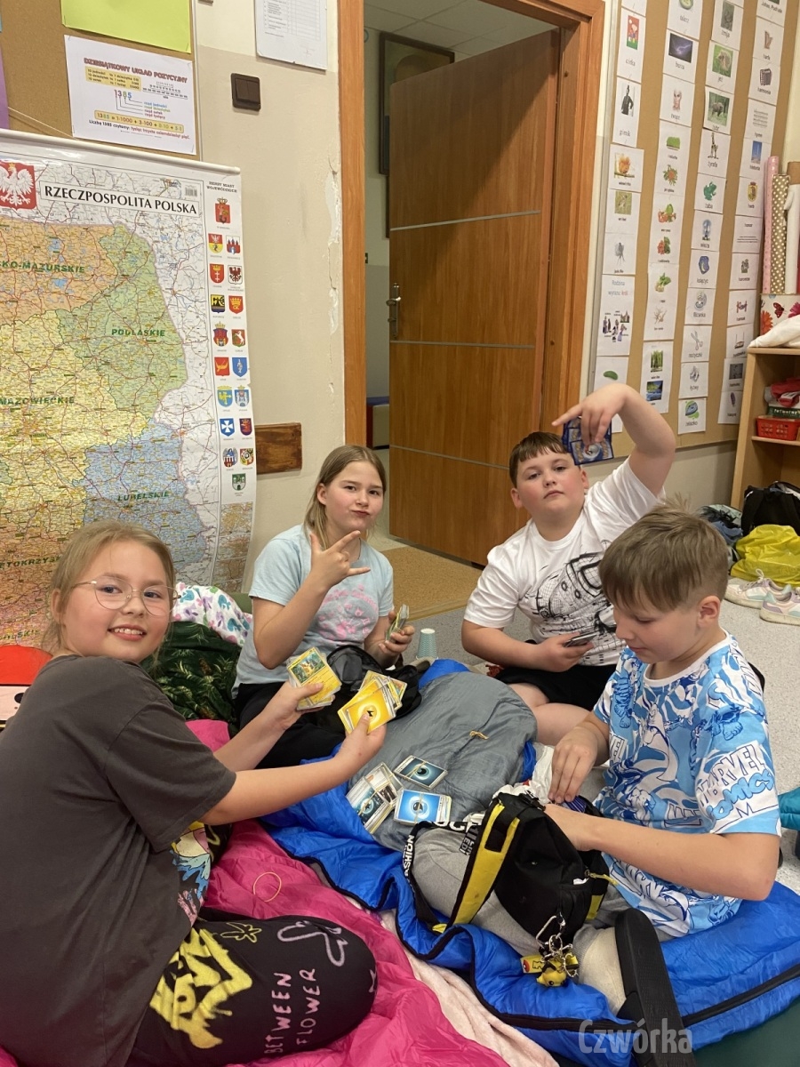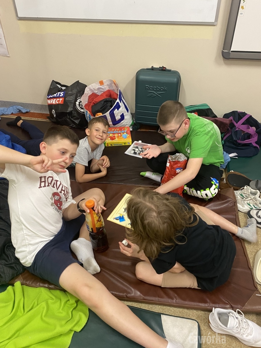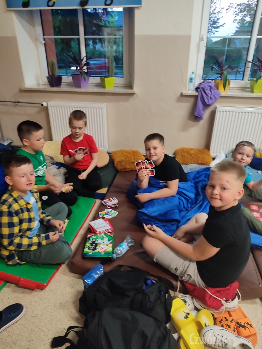 W piątek – 25 kwietnia o godzinie 17.30 do szkoły po raz drugi zaczęli przychodzić uczniowie klasy 2a i klasy 3b. Tym razem zamiast plecaków przynieśli śpiwory, piżamy, nocny prowiant i świetne humory. Najpierw z pomocą rodziców zamienili sale lekcyjne na „ sypialnie jednej nocy”. Następnie odbyły się zawody sportowe w sali gimnastycznej- oczywiście w drużynach byli uczniowie z różnych klas. Po sportowych emocjach i zaciętym kibicowaniu był czas wspólną ulubioną kolację – pizzę, która przygotowali rodzice. Potem były filmy, gry planszowe, poznawanie zakamarków szkoły przy świetle latarek i niekończące się nocne rozmowy z kolegami i koleżankami… Nikt się nie nudził, było radośnie, no i inaczej niż w ciągu dnia.