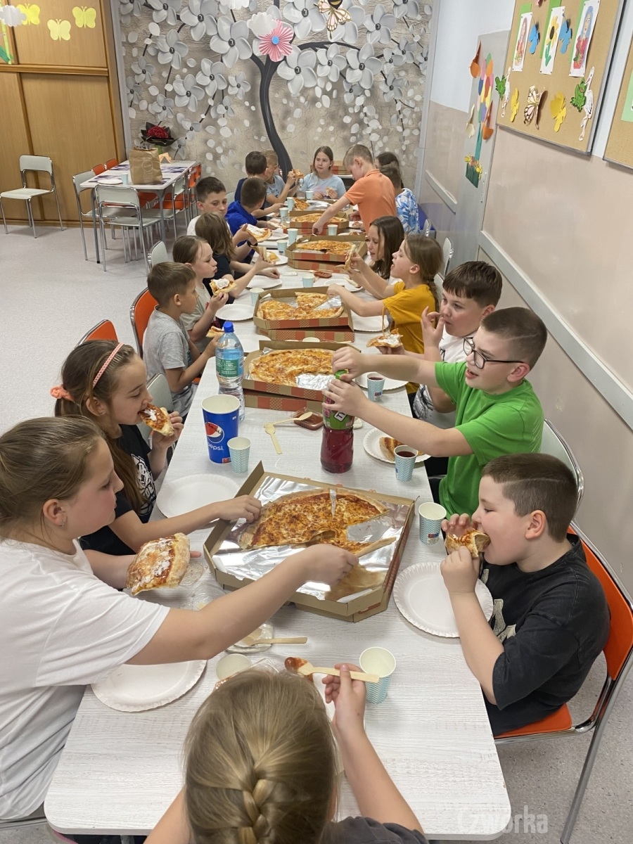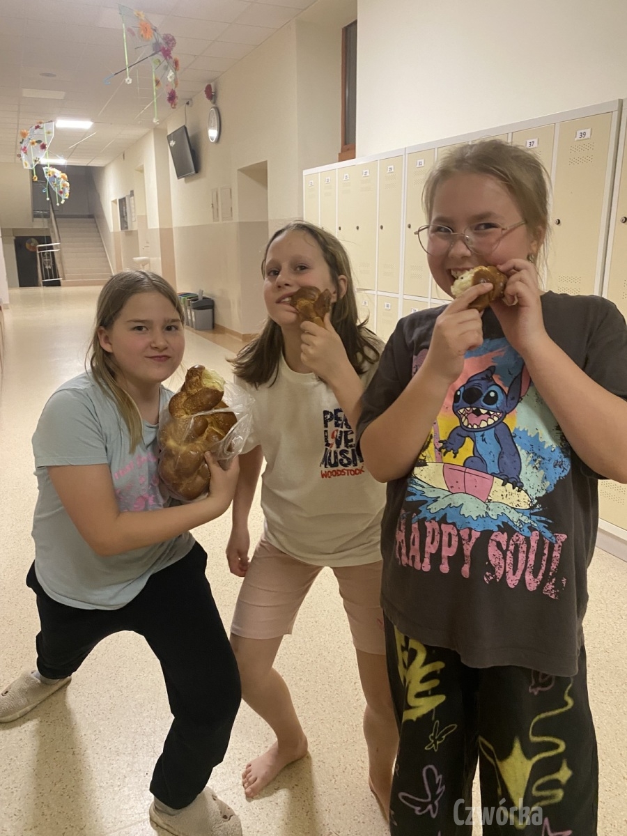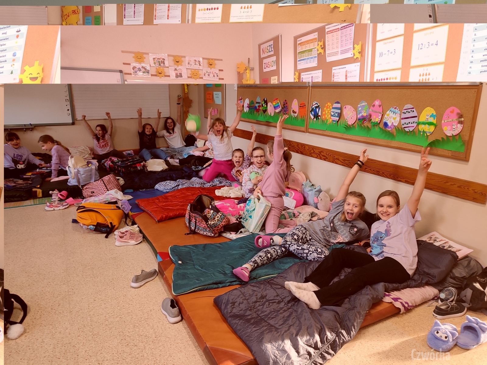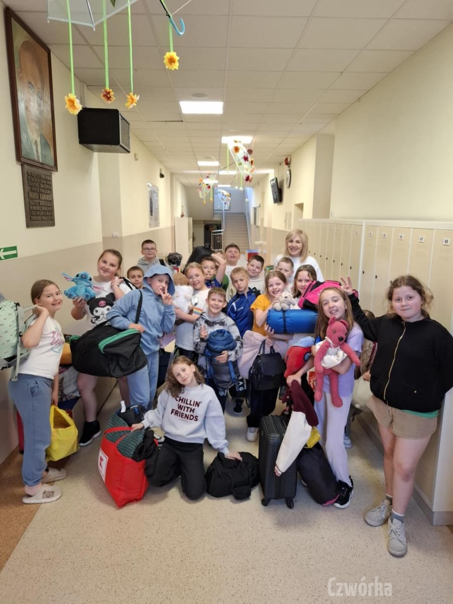 W piątek – 25 kwietnia o godzinie 17.30 do szkoły po raz drugi zaczęli przychodzić uczniowie klasy 2a i klasy 3b. Tym razem zamiast plecaków przynieśli śpiwory, piżamy, nocny prowiant i świetne humory. Najpierw z pomocą rodziców zamienili sale lekcyjne na „ sypialnie jednej nocy”. Następnie odbyły się zawody sportowe w sali gimnastycznej- oczywiście w drużynach byli uczniowie z różnych klas. Po sportowych emocjach i zaciętym kibicowaniu był czas wspólną ulubioną kolację – pizzę, która przygotowali rodzice. Potem były filmy, gry planszowe, poznawanie zakamarków szkoły przy świetle latarek i niekończące się nocne rozmowy z kolegami i koleżankami… Nikt się nie nudził, było radośnie, no i inaczej niż w ciągu dnia.