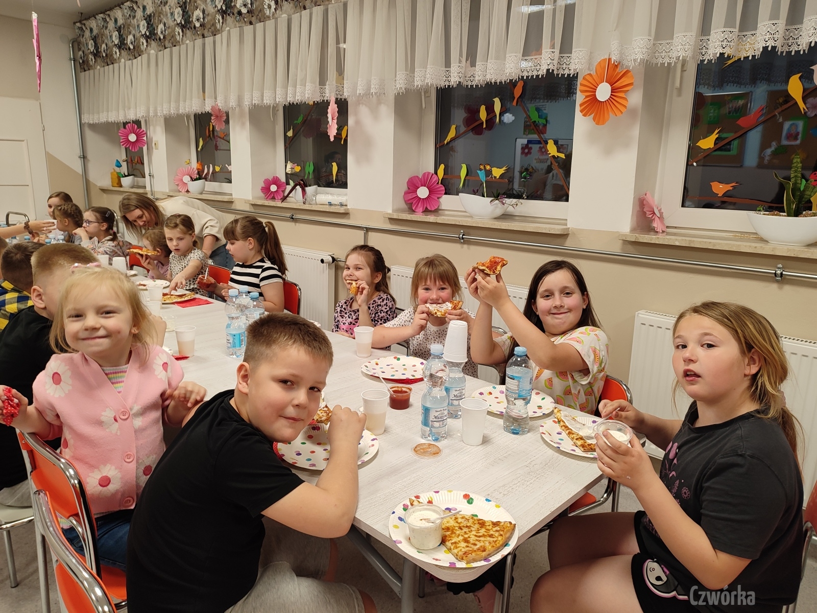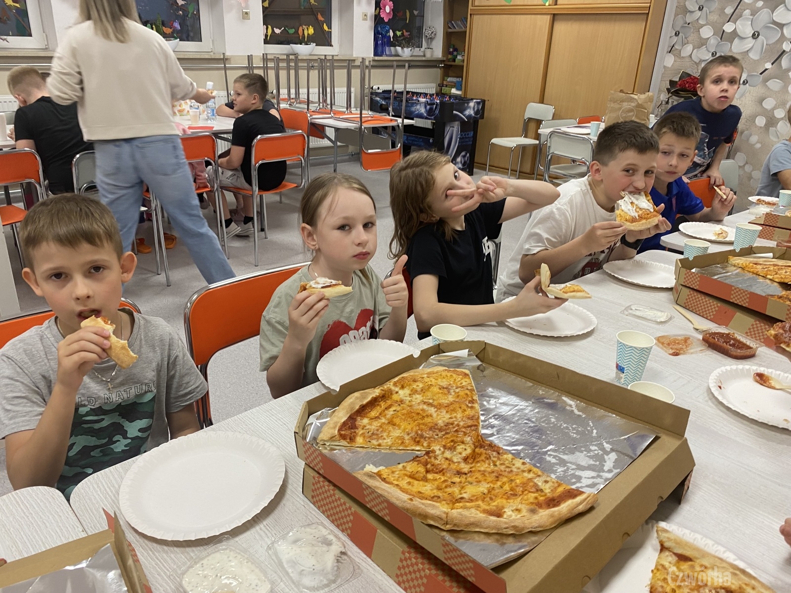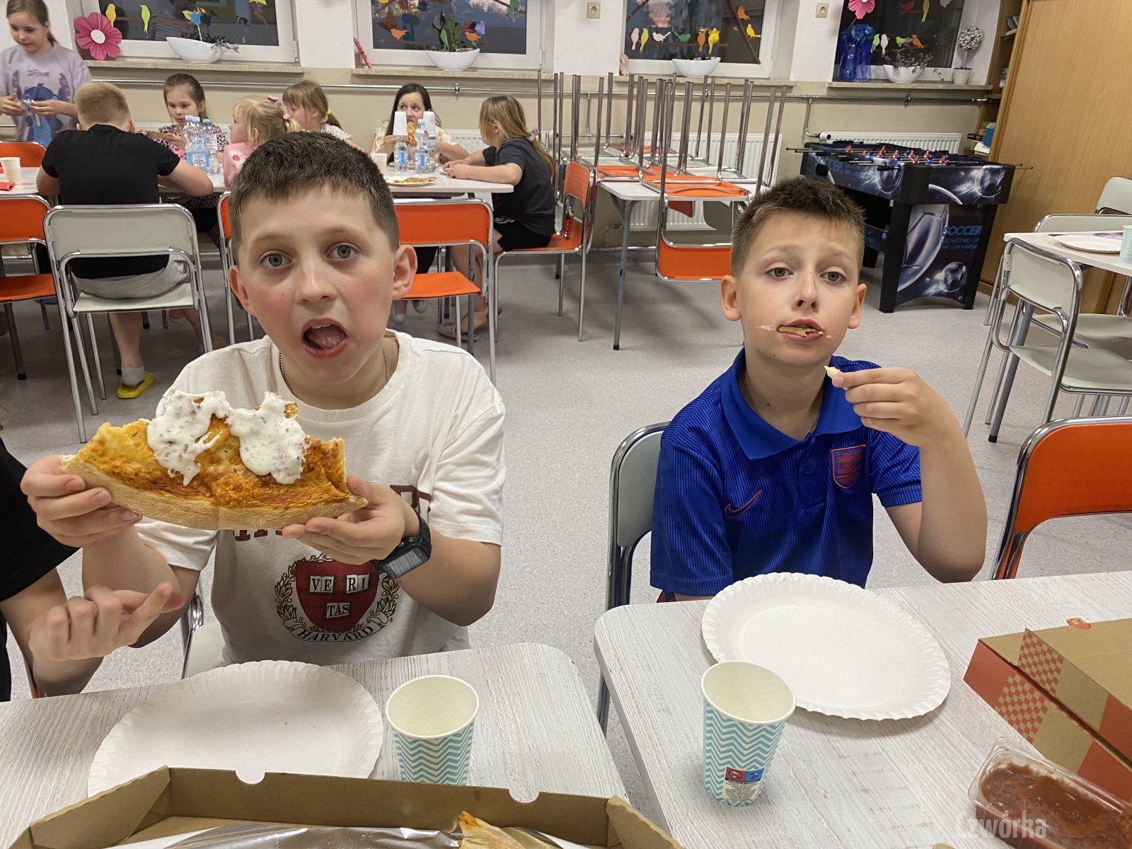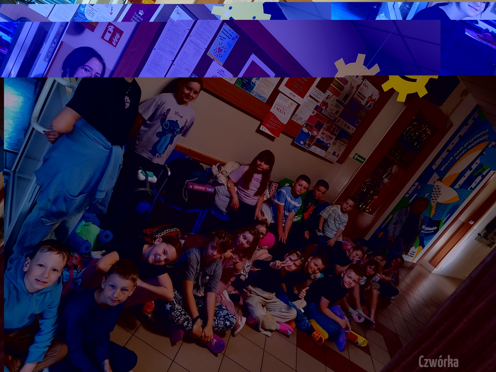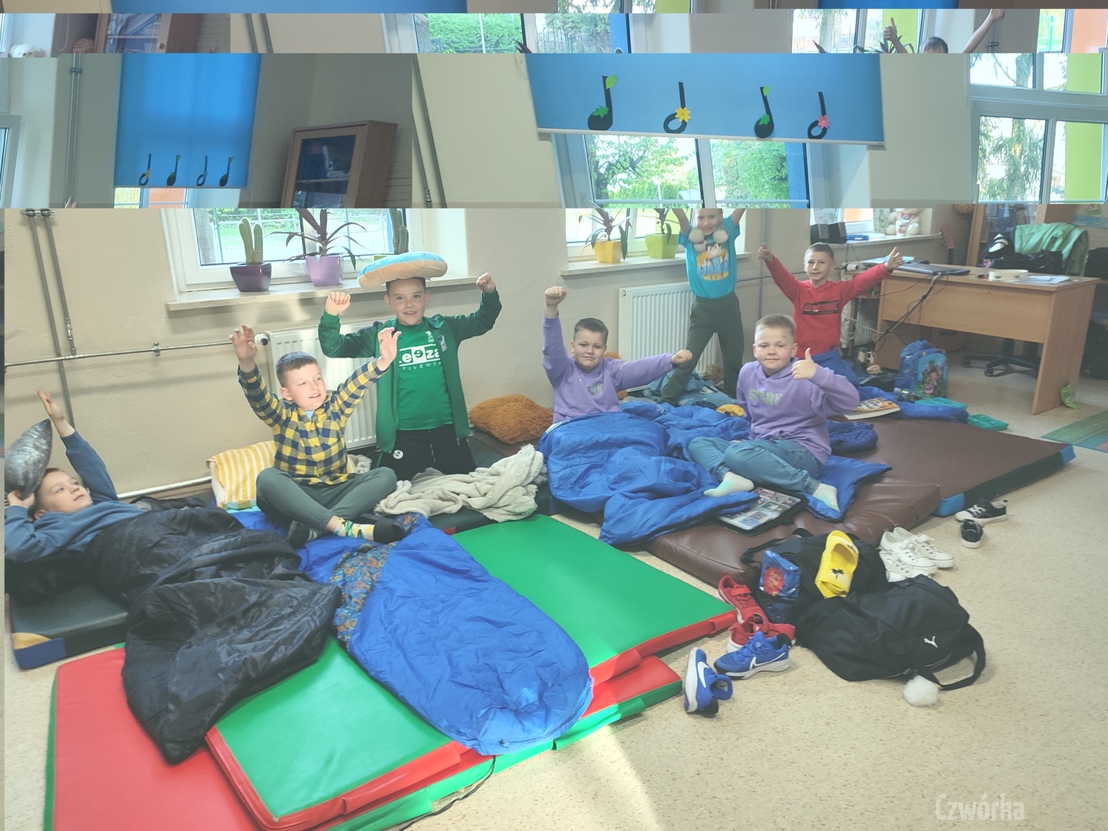 W piątek – 25 kwietnia o godzinie 17.30 do szkoły po raz drugi zaczęli przychodzić uczniowie klasy 2a i klasy 3b. Tym razem zamiast plecaków przynieśli śpiwory, piżamy, nocny prowiant i świetne humory. Najpierw z pomocą rodziców zamienili sale lekcyjne na „ sypialnie jednej nocy”. Następnie odbyły się zawody sportowe w sali gimnastycznej- oczywiście w drużynach byli uczniowie z różnych klas. Po sportowych emocjach i zaciętym kibicowaniu był czas wspólną ulubioną kolację – pizzę, która przygotowali rodzice. Potem były filmy, gry planszowe, poznawanie zakamarków szkoły przy świetle latarek i niekończące się nocne rozmowy z kolegami i koleżankami… Nikt się nie nudził, było radośnie, no i inaczej niż w ciągu dnia.