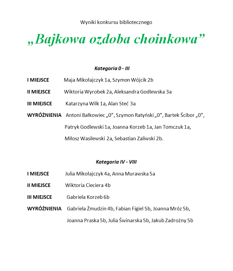 Wyniki konkursu bibliotecznego„Bajkowa ozdoba choinkowa”